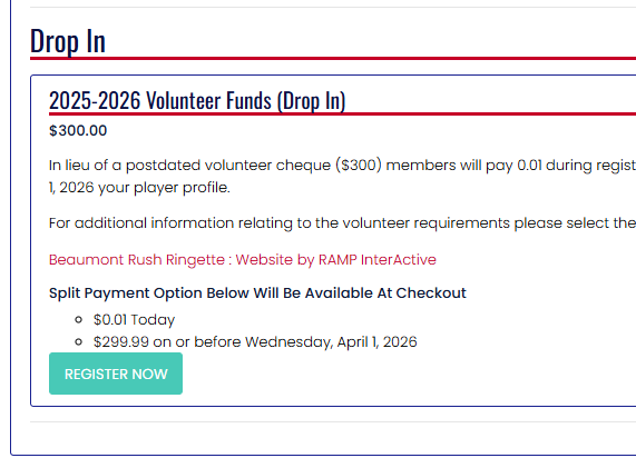 Complete the registration process for your athlete. You'll need to pay $0.01 when you register, and the remaining $299.99 will only be billed in April if you do not complete your volunteer commitment.
